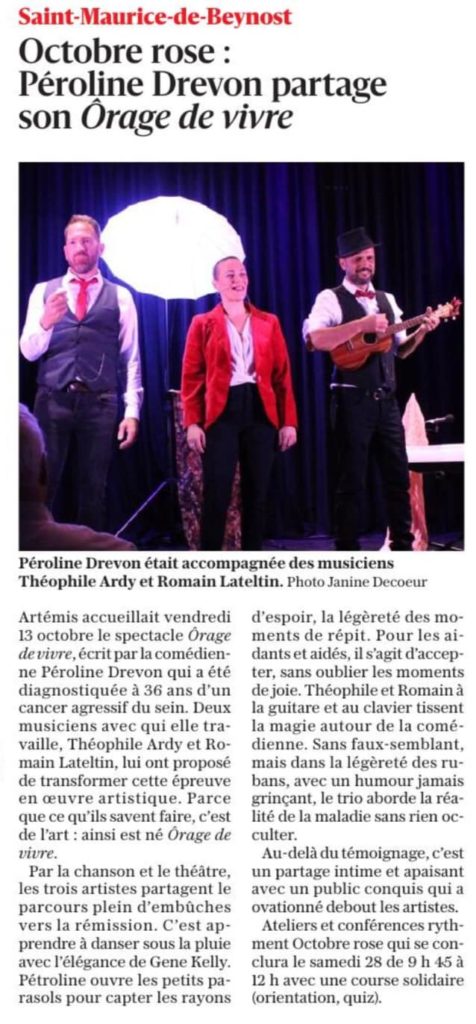 Octobre Rose et son cortège d’actions, c’est crucial pour parler du cancer du sein et je remercie celles et ceux qui s’engagent pour favoriser le dépistage. Ce spectacle, c’est la cerise sur le mamelon, du « live » qui lève les tabous, donne de l’espoir pour dédramatiser les soins et y puiser la force du combat.