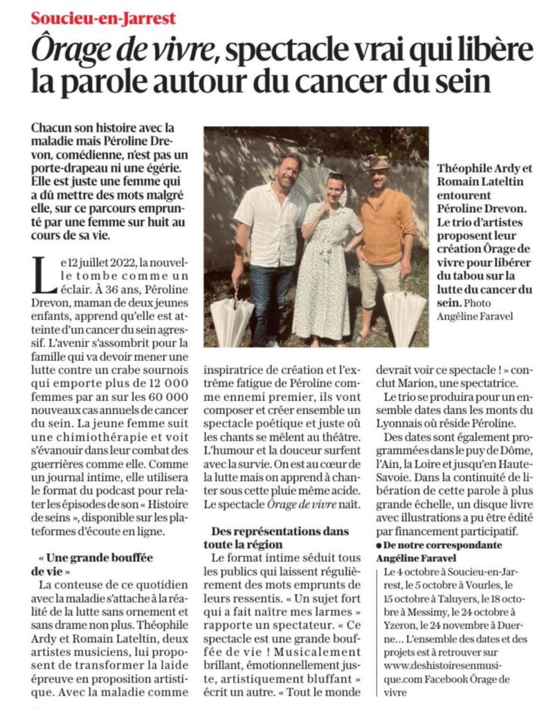 « Juchée sur un tabouret entre deux anges gardiens musicaux, Péroline déploie la soie de son histoire si personnelle de la maladie. Si personnelle et pourtant si partagée…