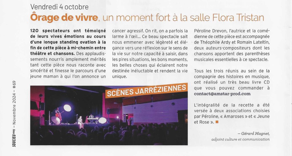 Pour suivre les actus du spectacle : Suivre la page facebook « Ôrage de vivre »