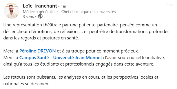 En tant que professionnel de santé, cette représentation nous amène, avec humilité, à remettre en question nos pratiques pour recentrer notre posture sur les attentes du patient : écoute et bienveillance, bien souvent rien de plus !!