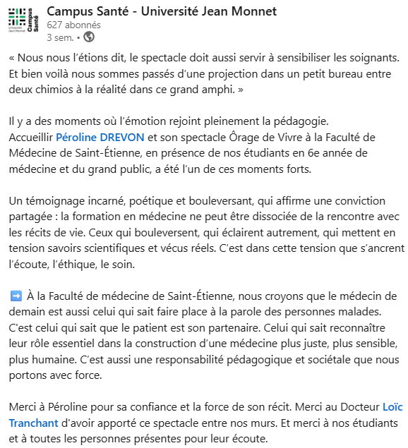 Péroline manie à merveille humour et gravité pour nous donner un beau témoignage de courage et de combativité !
